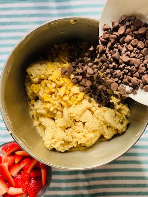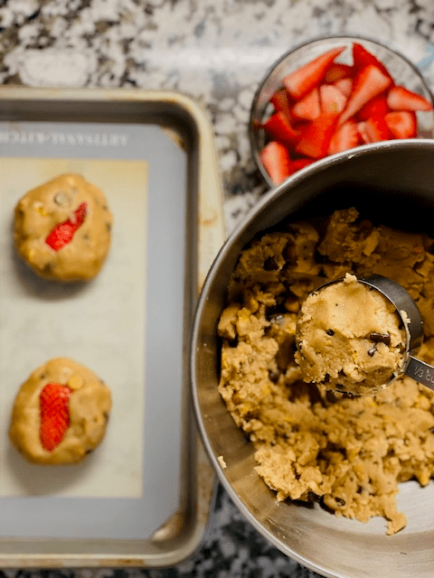 6. Line two baking sheets with parchment paper. Scoop the dough 1/3 cup at a time and place a strawberry slice in the middle of each scoop, making sure the berry is fully encased in dough. Firmly roll into round balls approximately 1 1/2 inches in diameter. While the dough ball is still in your hands, top each cookie with a strawberry slice, gently pushing it in to keep it in position while they bake. Place 6 cookies on each prepared baking sheet, spacing them out well. Bake on the middle and lower racks of the oven until the tops are light golden brown and you notice hairline cracks forming on the sides, 12 to 14 minutes, spinning each pan 180 degrees and swapping their positions halfway through.