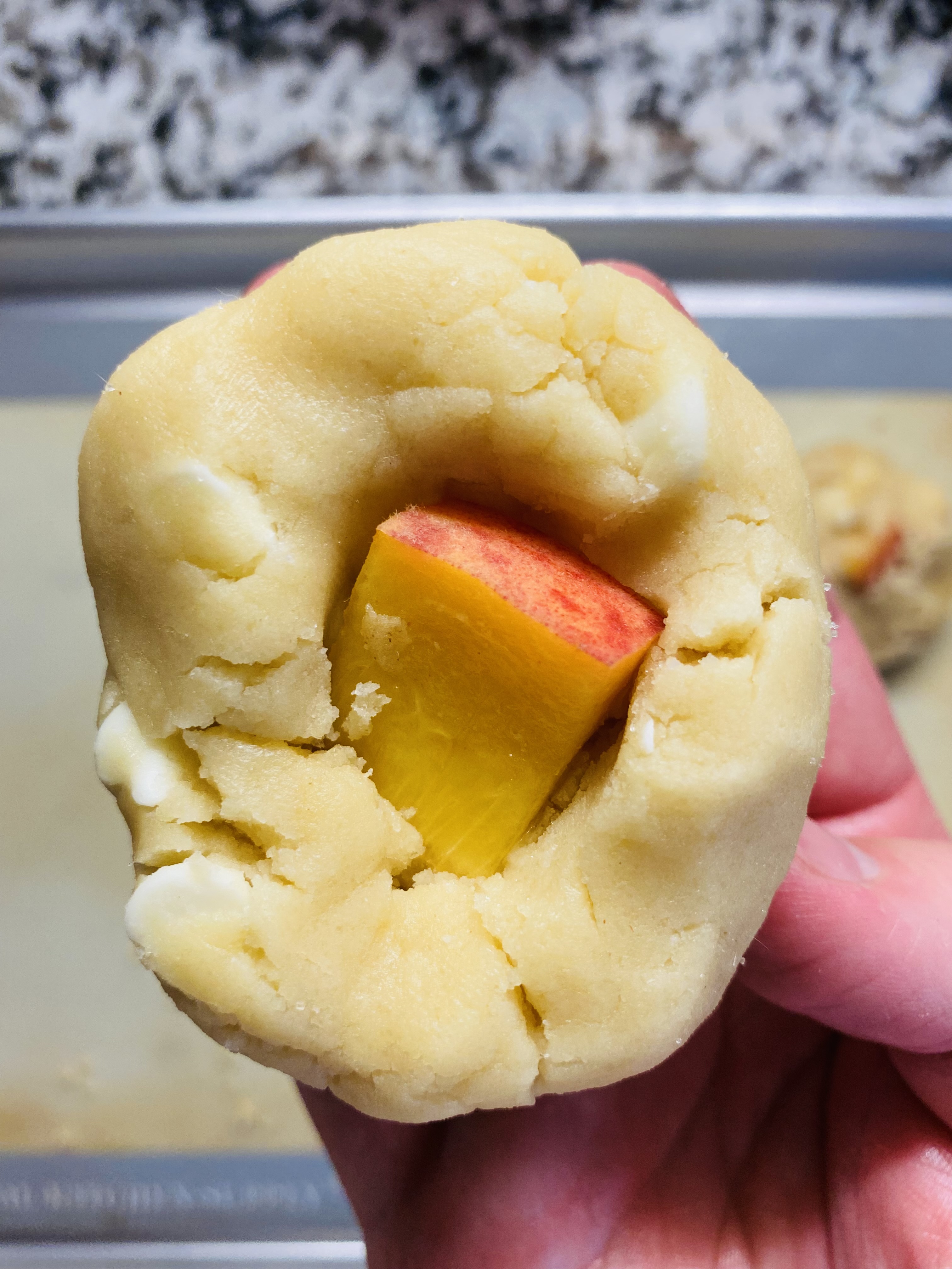 8. Line two baking sheets with parchment paper. Scoop the dough 1/3 cup at a time and place two peach slices in the middle of each scoop, making sure the fruit is fully encased in the dough.